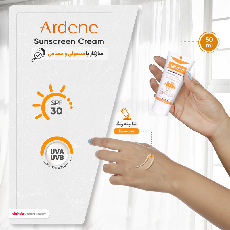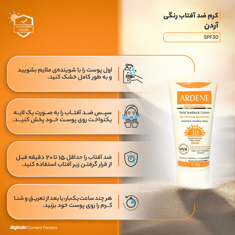 کرم ضدآفتاب رنگی آردن، انتخابی بینظیر برای محافظت از پوست شما در برابر اشعههای مضر خورشید است. این کرم با فرمولاسیون فیزیکی منحصربهفرد خود، به طور موثر از پوست حساس و معمولی شما در برابر اشعههای مضر UVA و UVB محافظت میکند و از بروز آسیبهای ناشی از آفتاب سوختگی، پیری زودرس و لکههای تیره جلوگیری میکند.