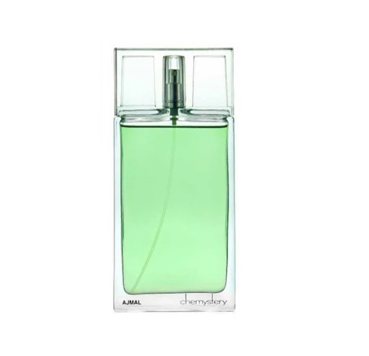 عطر و ادکلن اجمل چمیستری مردانه (چمستری سبز) عطری است جذاب و خوشبو که بطری آن از شیشه شفاف است و مایع داخل آن سبز رنگ است و یک درپوش شفاف پلاستیکی بر روی آن قرار گرفته است.
